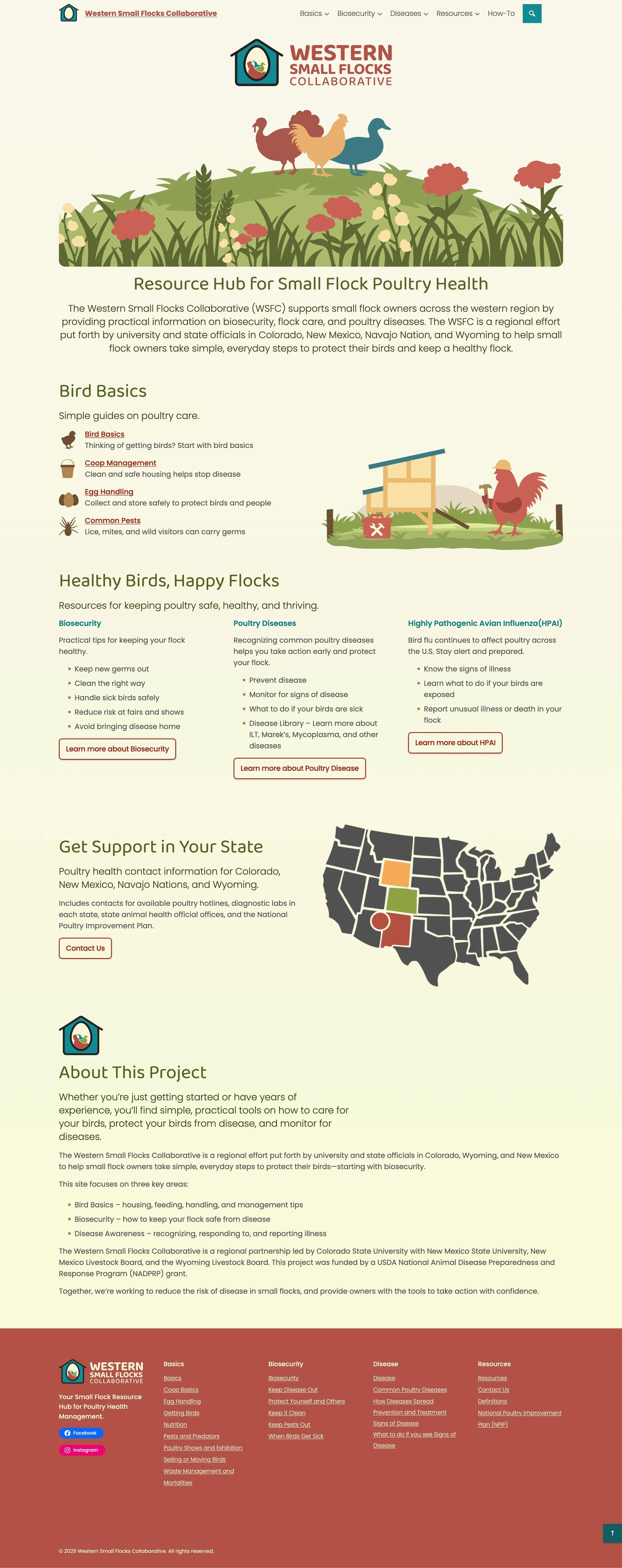 The Western Small Flocks Collaborative (WSFC) supports small flock owners across the western region by providing practical information on biosecurity, flock care, and poultry diseases. The WSFC is a regional effort put forth by university and state officials in Colorado, New Mexico, the Navajo Nation, and Wyoming to help small flock owners take simple, everyday steps to protect their birds and keep a healthy flock.
